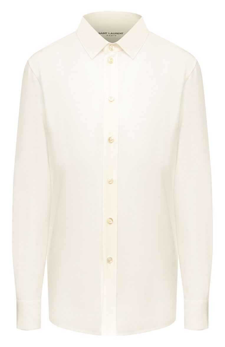 Белая блуза в классическом стиле — универсальный солда т в гардеробе. Беспроигрышные сочетания на любой случай: с синими джинсами, деловым костюмом или черными кожаными шортами. Мастера марки, основанной Ивом Сен-Лораном, сшили модель из шелкового крепа.