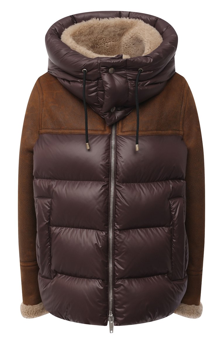 Пуховик из осенне-зимней коллекции не выглядит как модель в классическом прочтении за счет комбинации материалов. Куртке привили черты дубленки за счет вставки из плотной овчины с густым шелковистым мехом с изнаночной стороны. Изделие с объемным капюшоном выполнили из прочного текстиля, который не боится небольшого дождя.