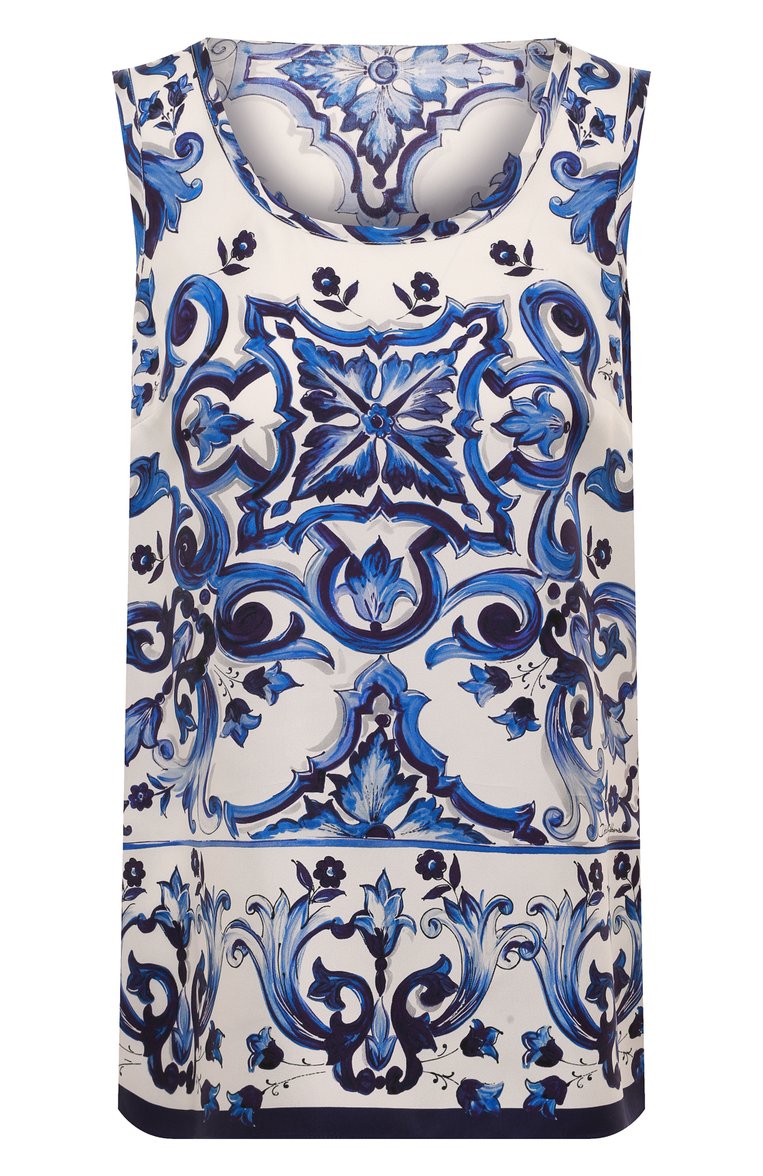 Этот свободный топ вошел в капсульную коллекцию Blu Mediterraneo, в которой Доменико Дольче и Стефано Габбана заменили яркую палитру знакового мотива Majolica только белым и насыщенным синим цветами. Принт, почти в точности повторяющий майолику со ступеней лестницы Санта-Мария-дель-Монте в Кальтаджироне, нанесли на тонкий струящийся шелк. Чтобы детали рисунка оказались ровно по центру изделия, ткань с ювелирной точностью раскроили вручную.