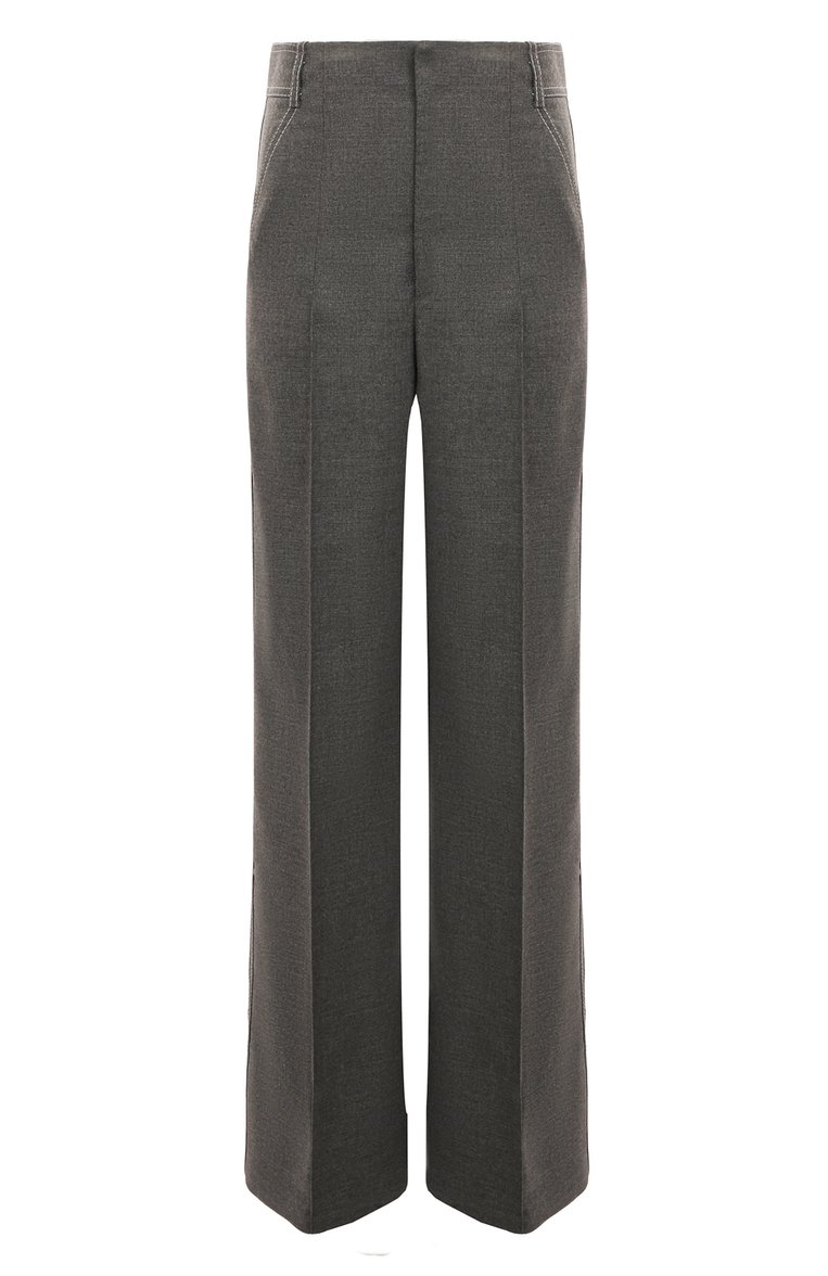Доротея Шумахер выбрала для пошива серых широких брюк фактурную ткань, которая легко тянется и не мнется. В состав материала добавили шелковистую вискозу из переработанной древесины эвкалиптов, выращенных в возобновляемых лесах, поэтому модель получилась особенно приятной на ощупь. Четкие стрелки, двойные контрастные строчки, как у джинсов, и высокая посадка визуально удлиняют ноги.