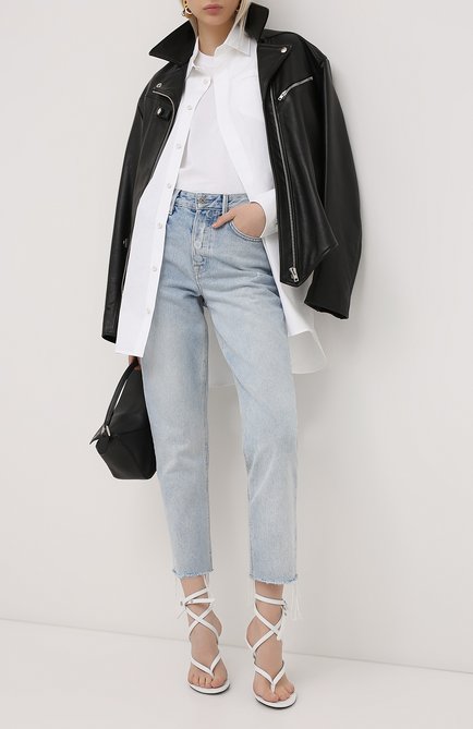 Свободные голубые джинсы с высокой посадкой и широкими отворотами сшили из легкого прочного хлопка. Чтобы создать эффект одежды с историей, готовую пару обработали озоном: так получилось сократить расход воды по сравнению с традиционной технологией стирки с камнями. Поддержать непринужденный тон модели наши стилисты предлагают свитером силуэта oversize и шлепанцами на платформе.
