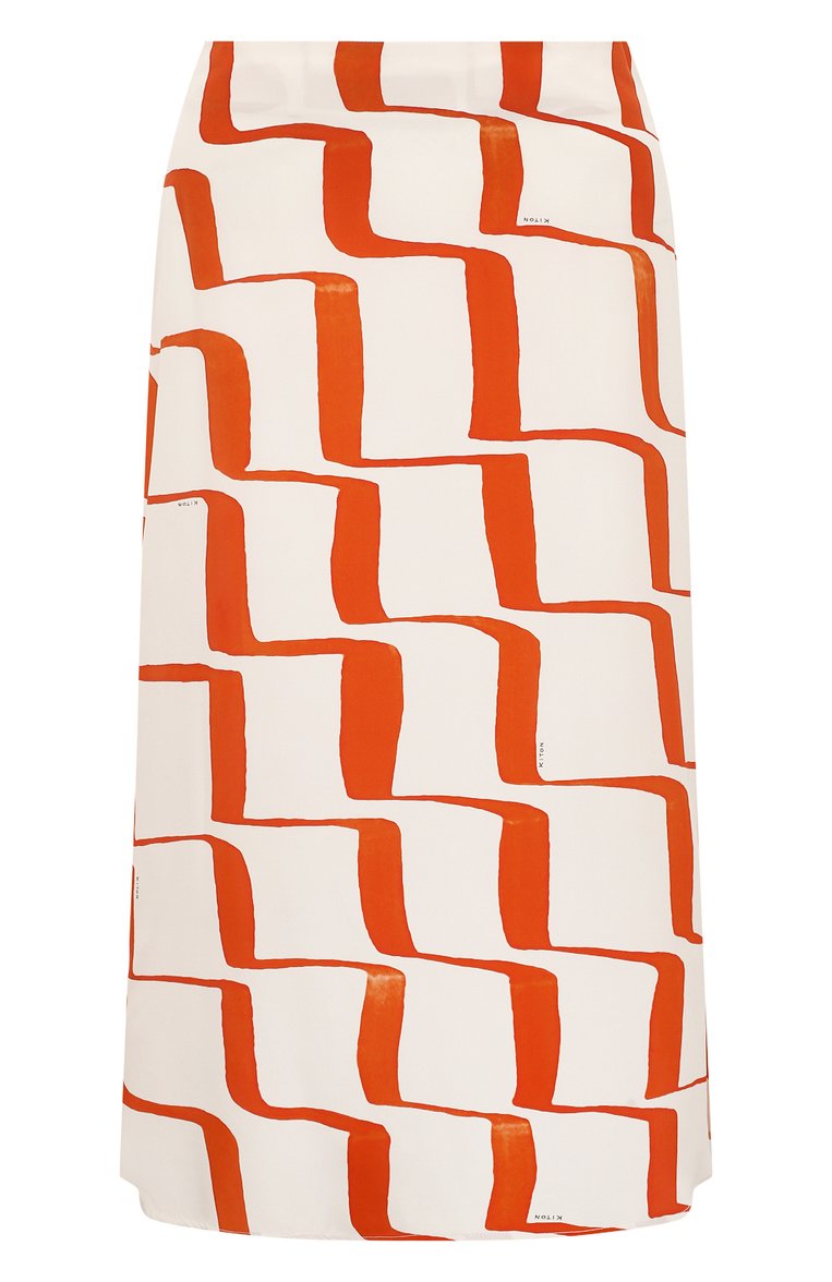 Юбка длиной чуть ниже колена справится с ролью ключевого акцента в образе. Все дело в ярком геометричном орнаменте, будто нарисованном оранжевой краской от руки. Мотив нанесли на тонкий, приятный на ощупь шелк, который славится своей легкостью и нежностью.