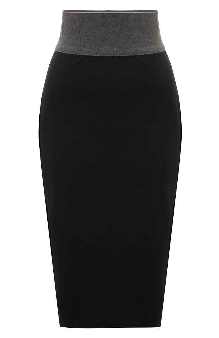 Черная юбка с завышенной посадкой и широким поясом подчеркнет талию. Для производства изделия мастера марки, основанной Брунелло Кучинелли, использовали тонкий легкий трикотаж. Материал выполнили на собственной мануфактуре бренда из самых длинных волокон хлопка премиальных сортов, поэтому вещь особенно мягкая.