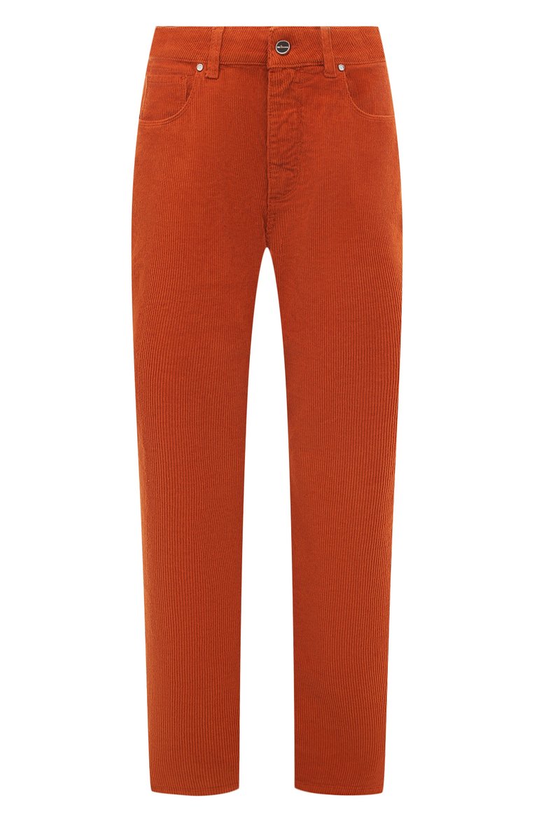 Оранжевые брюки с высокой посадкой унаследовали крой с пятью карманами от джинсов, но сменили деним на фактурный вельвет. Длинноволокнистый хлопок делает ткань особенно мягкой, а стрейчевые нити придают ей эластичность, поэтому слегка зауженная модель не сковывает движения. Сзади на поясе вышили нитями в тон крупную фирменную литеру K.