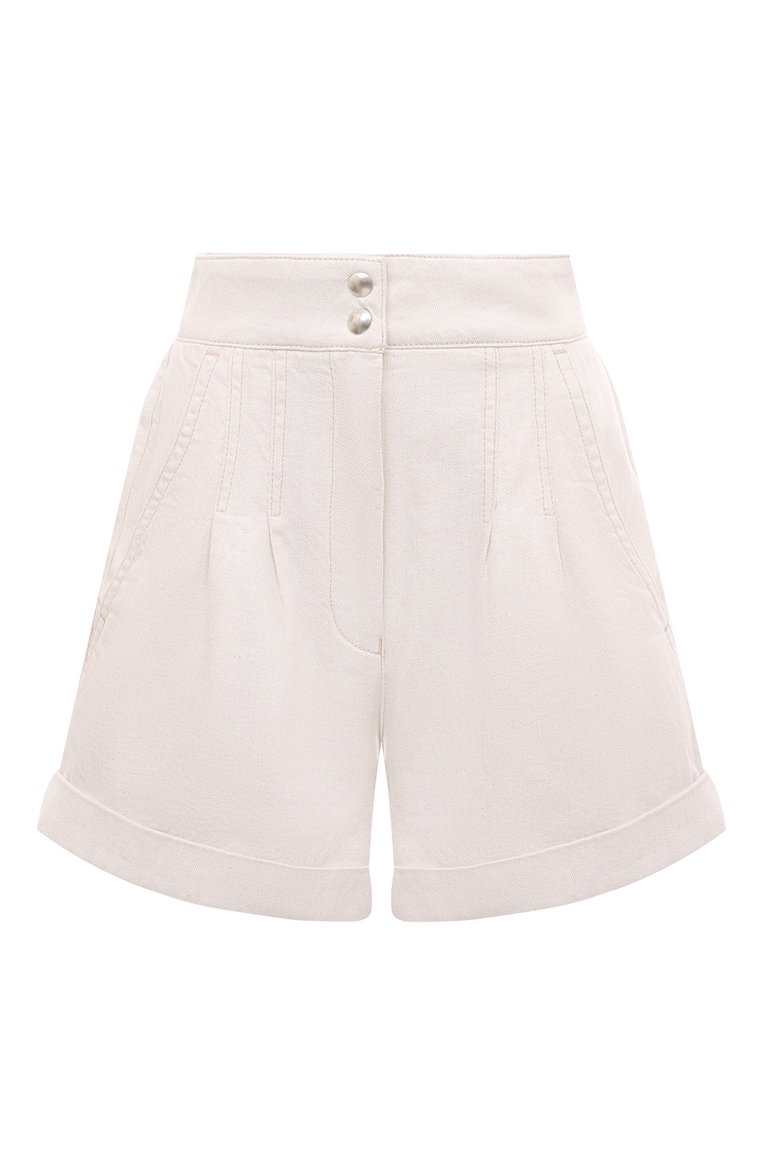 Лаконичные молочно-белые шорты с высокой посадкой, защипами и отворотами легко вписать в летние образы любой цветовой палитры. Для пошива модели с четырьмя карманами использовали хлопковый твил: такой материал отличается прочностью, а благодаря добавлению в состав льна изделие сохраняет ощущение комфорта даже в жару.