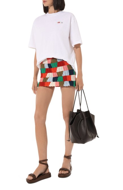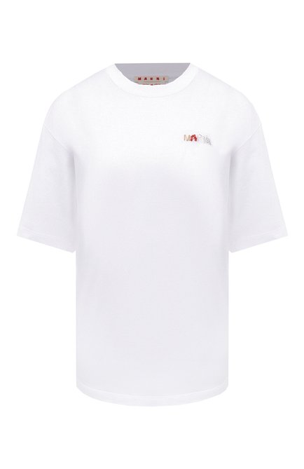 Прямую футболку с круглым вырезом выполнили из хлопкового джерси. Изделие украсили спереди крупным принтом в виде двух смайлов, логотипа марки и надписи Let me be your smile. Модель сочетается и с джинсами, и с шортами.