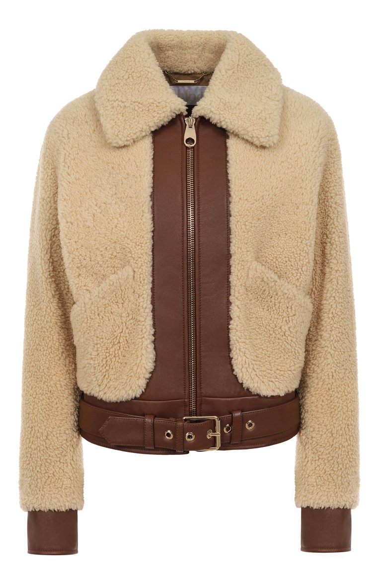 Дубленку с хлопковым подкладом выполнили из комбинации овчины и кожи. Мо дель с двумя карманами и регулируемым съемным ремнем застегивается молнией.